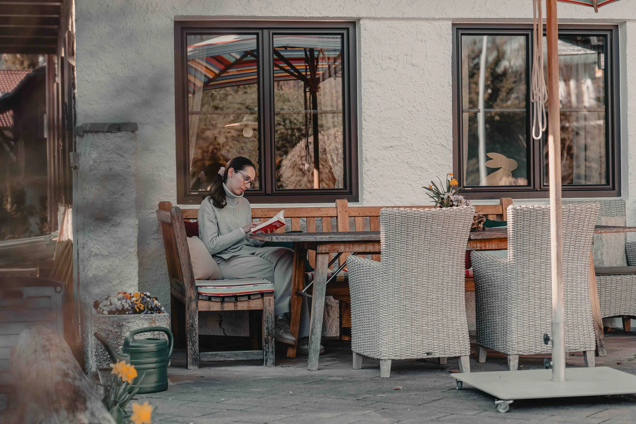 Gemütliche Leseecken, eine große Auswahl an Büchern und der Blick in die Berge schaffen eine Atmosphäre, in der man sofort zur Ruhe kommt. Die großzügige Terrasse mit Barbecue-Möglichkeiten lädt dazu ein, Zeit im Freien zu verbringen – ob beim gemeinsamen Essen oder entspannten Abenden.